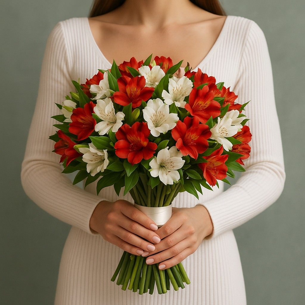 Яркая композиция из рубиновых и белоснежных альстромерий, символизирующих гармонию страсти и чистоты. Этот букет идеально подойдёт для искреннего признания, дружеского поздравления или торжества, где важны эмоции и живые краски.