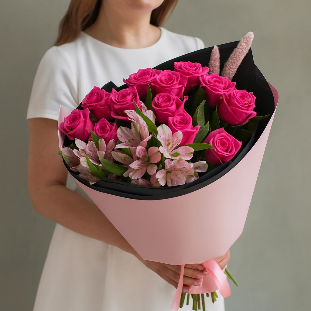 Яркий и стильный букет с насыщенными розовыми розами и нежной альстромерией. Его контрастная упаковка и выразительные оттенки делают композицию универсальным подарком для любого торжества.