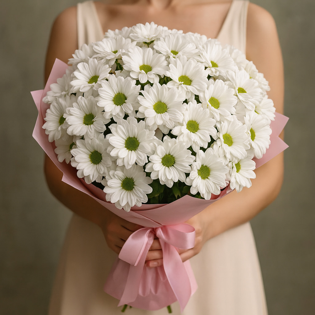 Букет из белых кустовых хризантем в розовой упаковке — символ чистоты, искренности и гармонии. Нежные белые лепестки и свежая зелень делают композицию универсальным подарком для любого повода.