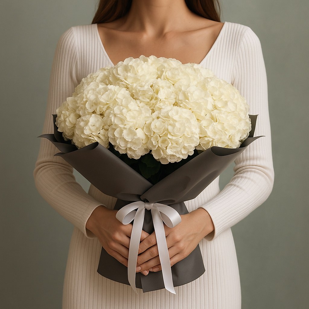 Элегантный и утончённый букет из нежных белых гортензий — символ чистоты, гармонии и нежных чувств. Такой букет станет прекрасным подарком для самых важных событий: свадьбы, юбилея или романтического признания. Его лёгкая воздушность и классическая изысканность подчеркивают торжественность момента.