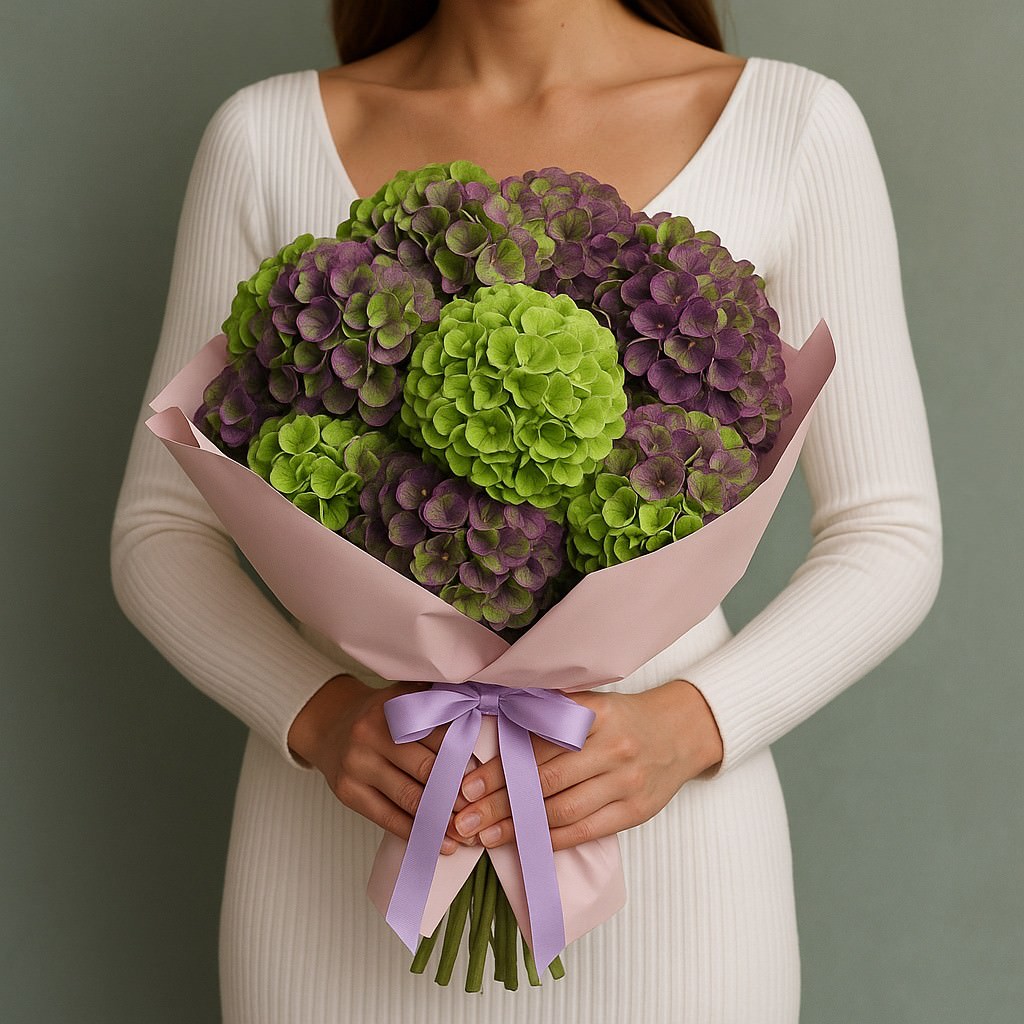Яркий и необычный букет из гортензий в изумрудно-зелёных и пурпурных оттенках. Такой подарок наполнен энергией, свежестью и шармом, он подойдёт для особых случаев и обязательно привлечёт внимание своей оригинальностью.