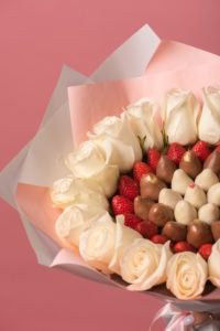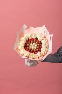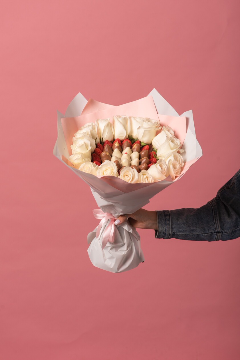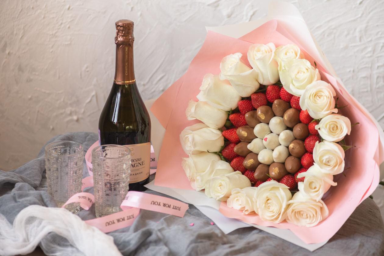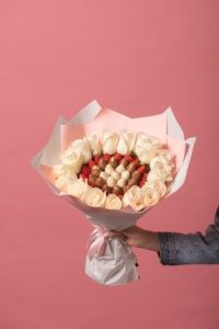 Просим заметить — чтобы ваш букет был максимально красивым и презентабельным, количество клубник в данном букете может на пару штук быть больше или меньше, это делается для того, чтобы получился ровный круг в букете!