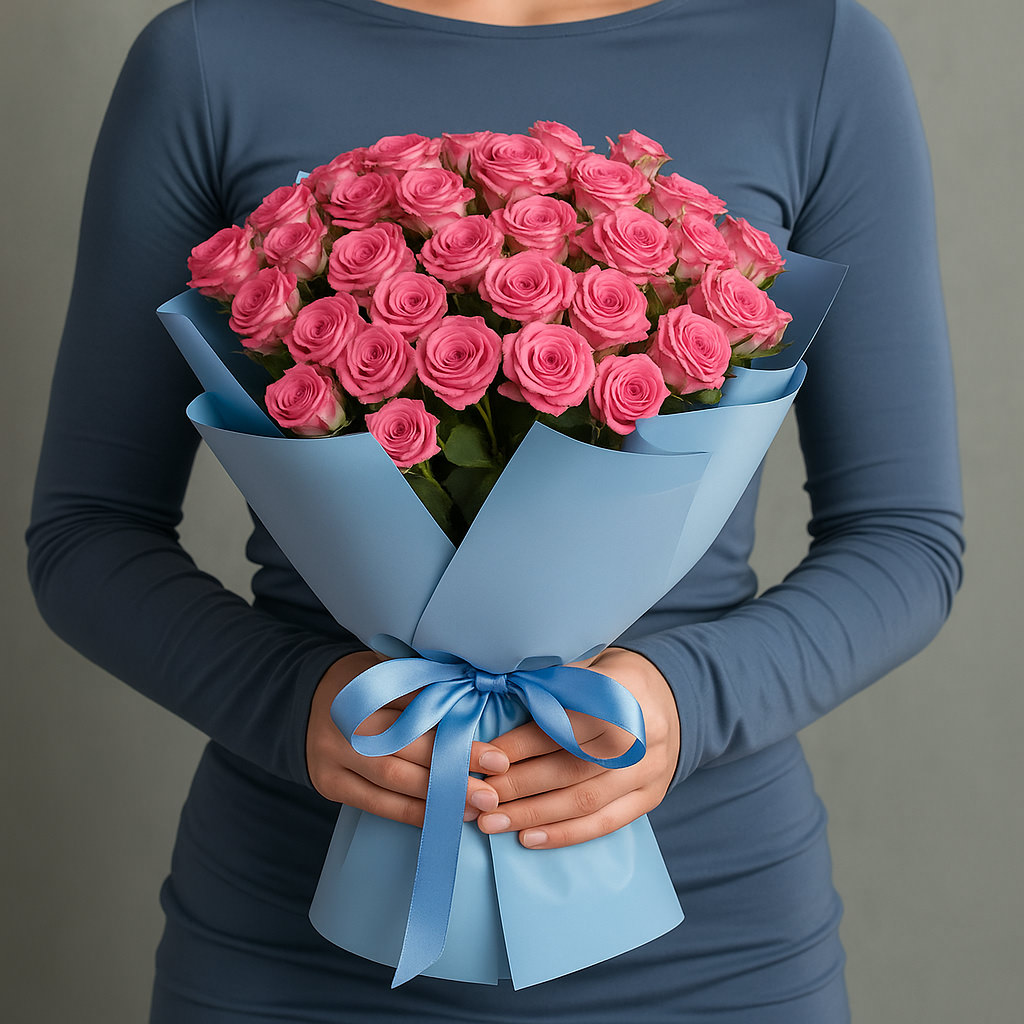 Очаровательный букет нежных розовых кустовых роз в элегантной голубой упаковке — это символ изысканности, нежности и гармонии. Такая композиция станет идеальным подарком на день рождения, юбилей, романтическое свидание или просто в знак внимания, подчеркивая ваши самые тёплые чувства.