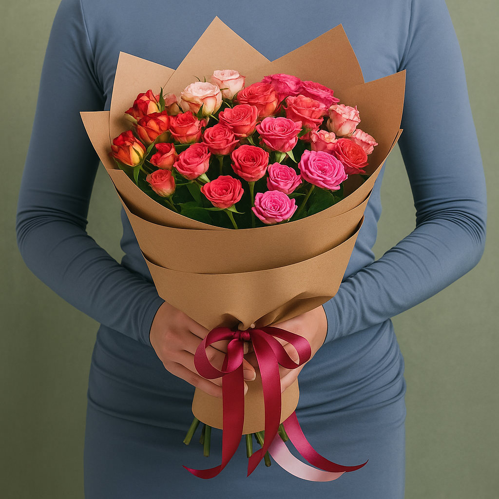 Стильный букет из розово-красных кустовых роз в крафтовой упаковке подчеркнёт искренность эмоций. Такой подарок станет идеальным для признания в любви, юбилея или торжества, оставив яркое впечатление надолго.