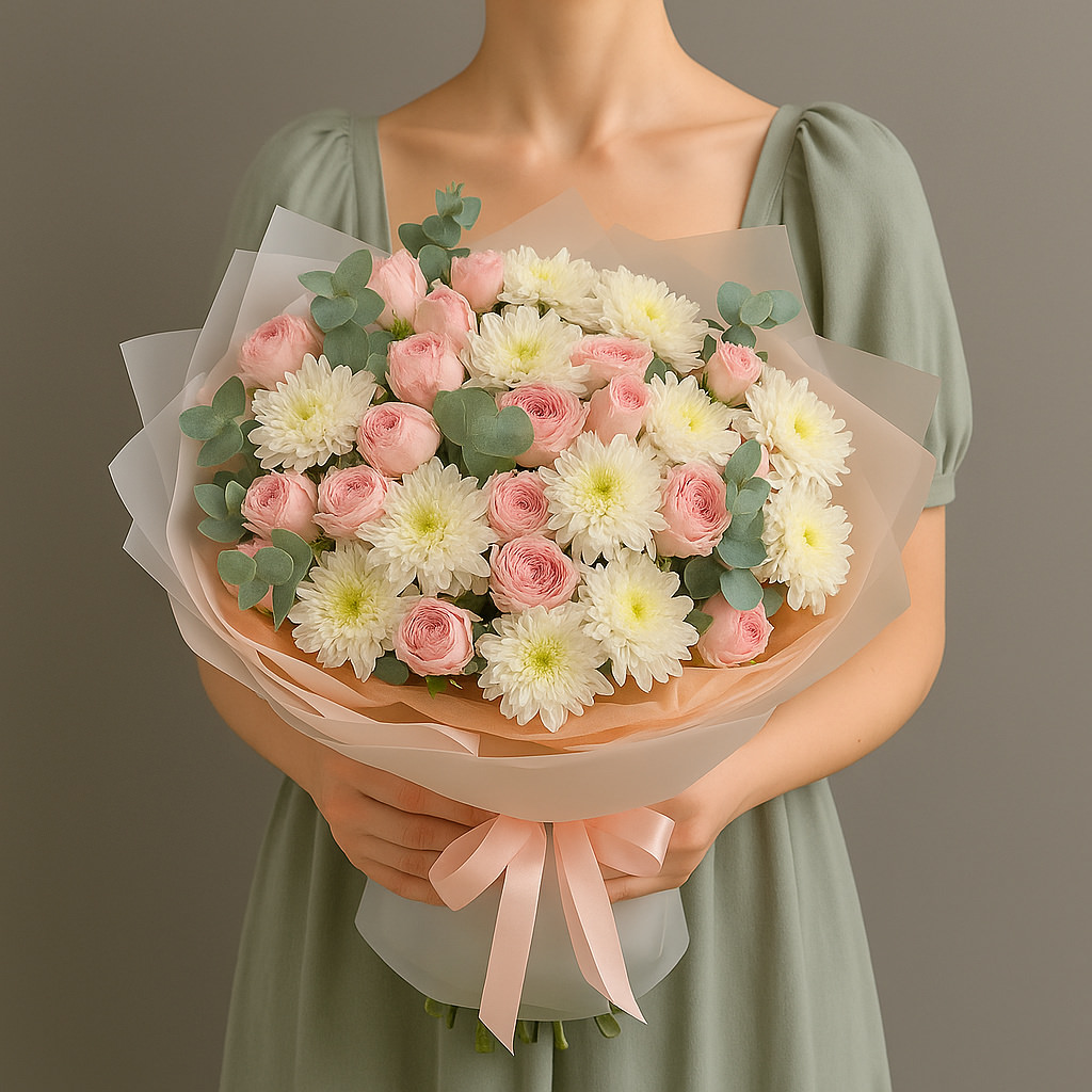 Букет «Нежные грёзы» — лёгкий и воздушный подарок, наполненный гармонией и романтикой. Сочетание мягко-розовых роз с белыми хризантемами создаёт ощущение тепла и нежности.