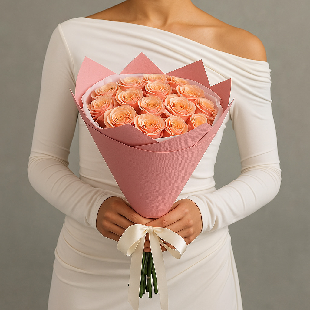 Нежный букет из персиковых роз в стильной розовой упаковке станет утонченным подарком для любого повода. Теплые оттенки роз создают атмосферу уюта и заботы, подчеркивая вашу искренность и внимание. Идеально для романтического свидания, поздравления с днем рождения или просто чтобы порадовать близкого человека.