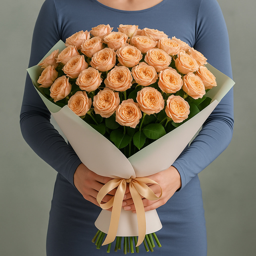 Элегантный букет персиковых пионовидных роз — изысканный выбор для самых утончённых подарков. Нежные бутоны с бархатными лепестками символизируют гармонию и нежность, а стильное оформление подчёркивает их природную красоту. Такой букет станет прекрасным презентом для дня рождения, годовщины, свадьбы или просто тёплого признания в чувствах.