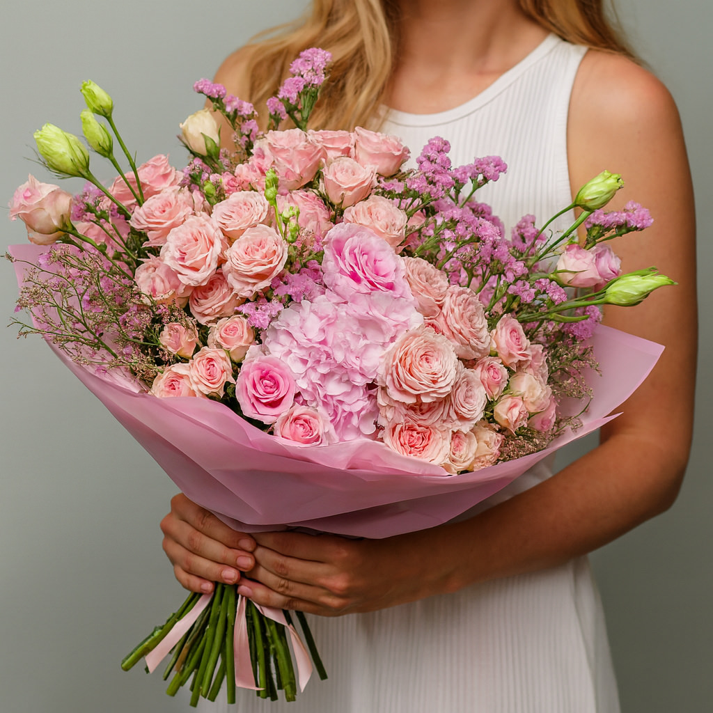 Роскошный букет из нежных роз, гортензии и эустомы в изысканных розовых оттенках. Он создаёт атмосферу романтики и станет идеальным подарком для самых тёплых и трогательных моментов.
