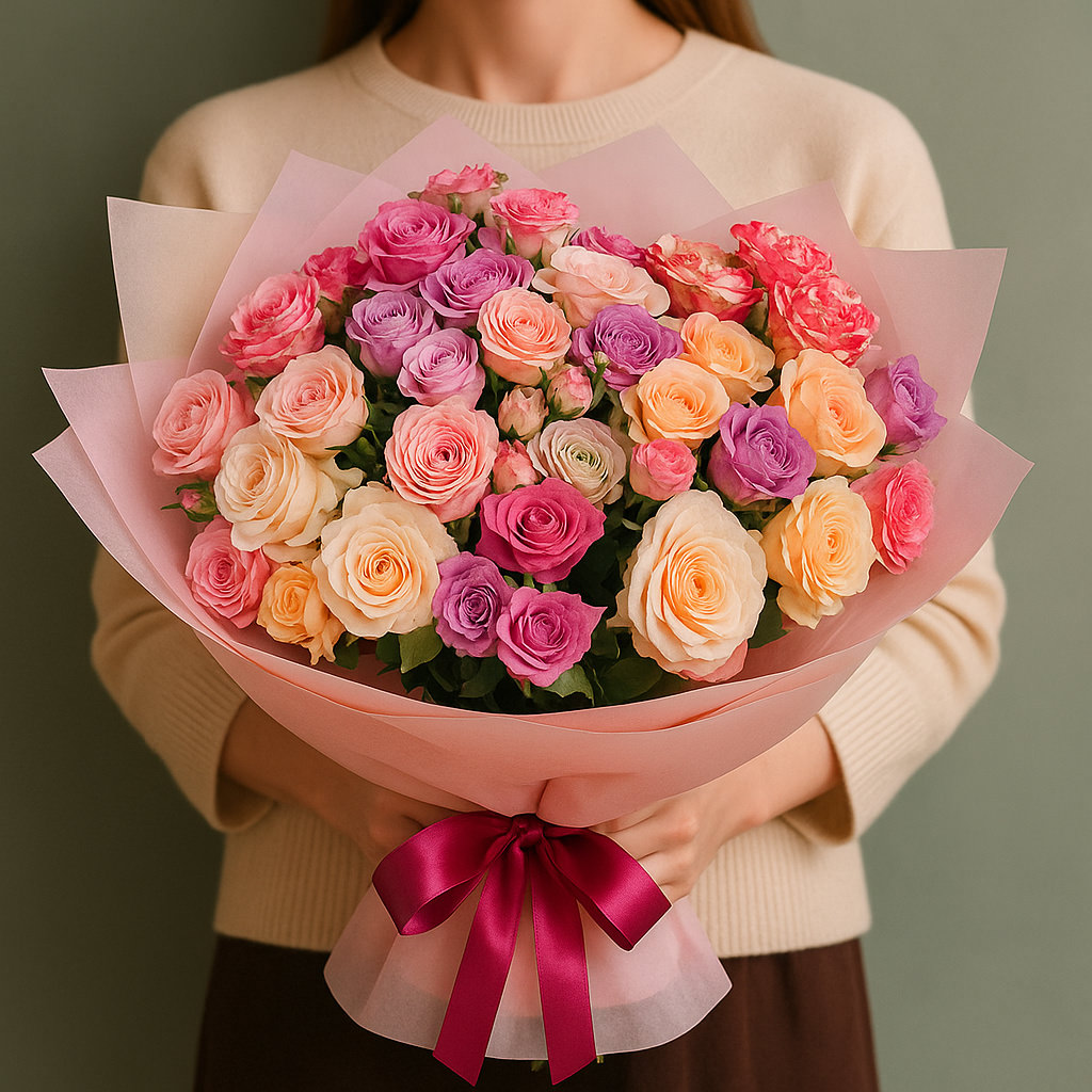 Изысканный букет в нежных пастельных оттенках — воплощение гармонии и утончённости. Сочетание розовых, сиреневых и кремовых оттенков создаёт атмосферу лёгкости, романтики и весеннего вдохновения. Такой подарок будет радовать глаз и сердце, подойдёт для любого торжества, будь то день рождения, годовщина или признание в любви.