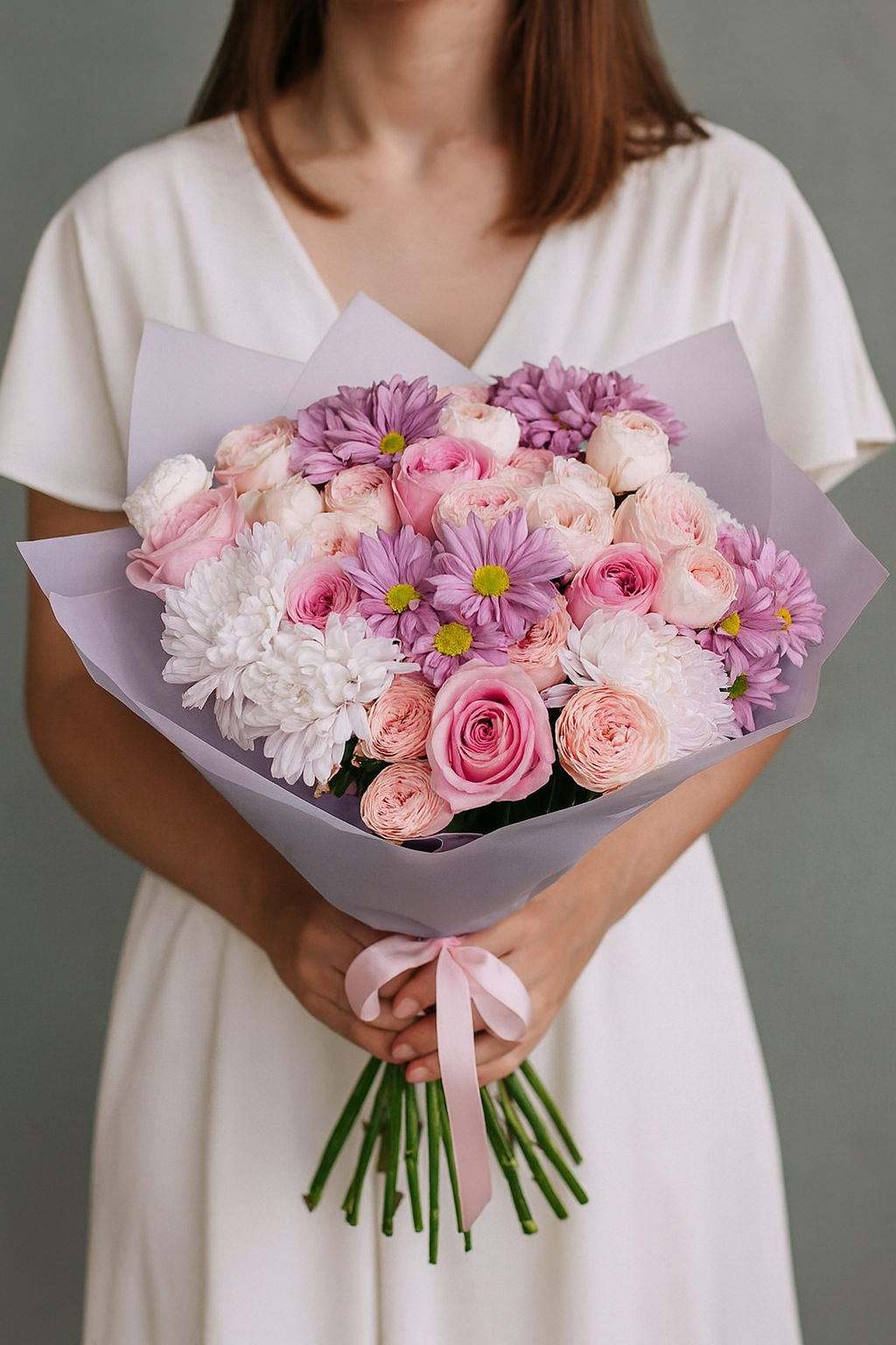 Элегантный букет из нежных роз и воздушных хризантем в розово-сиреневой гамме. Роскошная композиция подарит тепло, гармонию и станет ярким акцентом для любого торжества.