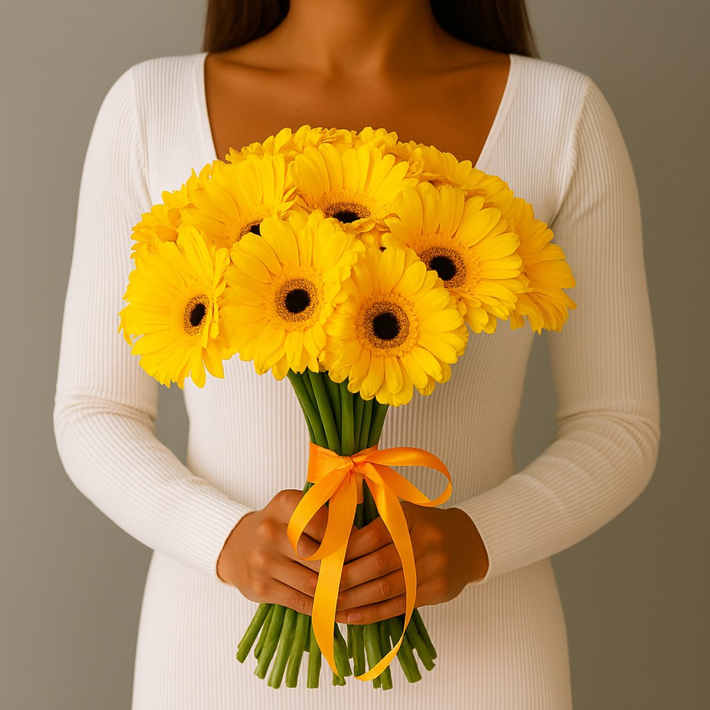 Яркий и жизнерадостный букет из насыщенно-жёлтых гербер, собранный в классическую композицию. Лучистые цветы наполняют настроение светом и энергией, а оранжевая атласная лента подчёркивает их сияние.