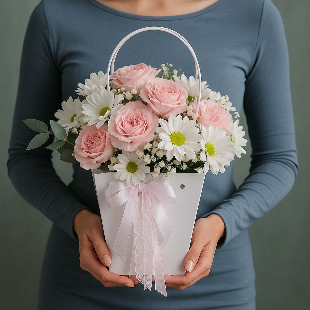 Композиция в сумочке с розами и ромашками — лёгкий и романтичный вариант для подарка любимым.