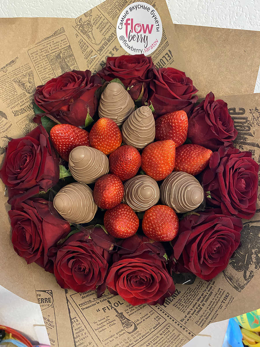 Тандем клубники в шоколаде и розами, который точно покорит ее.