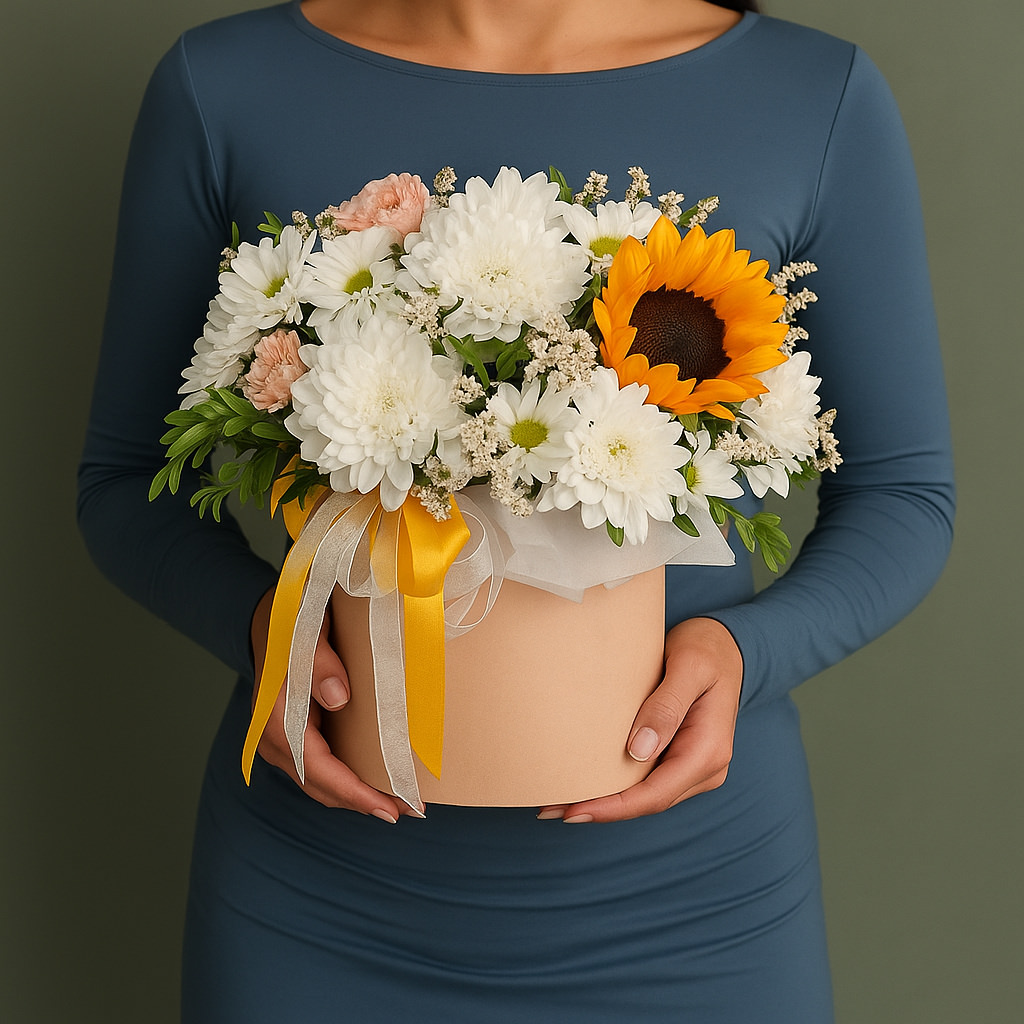 Яркая и жизнерадостная композиция с подсолнухом и хризантемами — отличный подарок для поднятия настроения и создания атмосферы праздника.