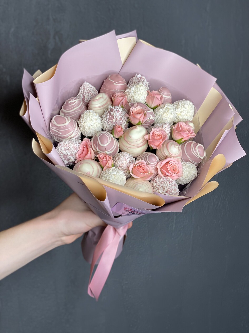 Нежное сочетание кустовой розы и клубники в шоколаде с дизайнерским решением упаковки!