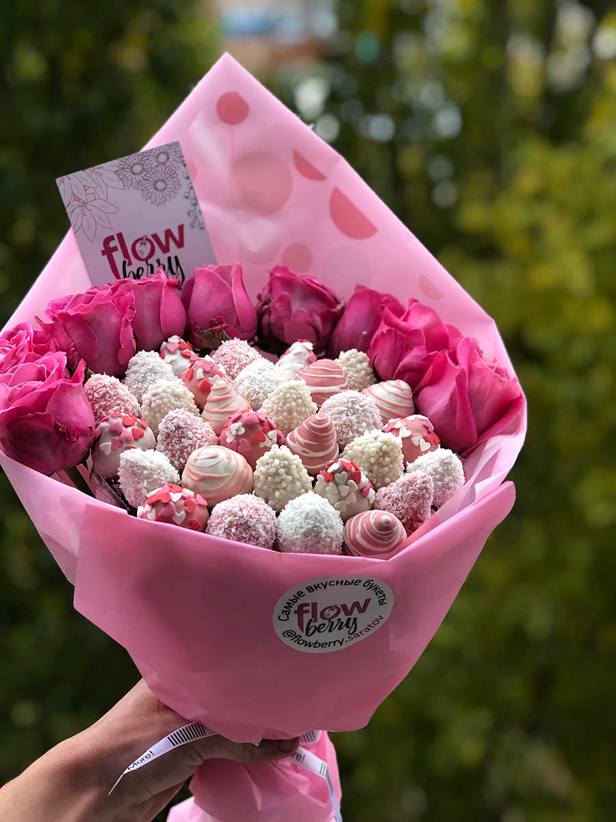 Букет с клубникой «Виолет» покорил сердца милых дам, своими нежными нотками белого и розового шоколада!